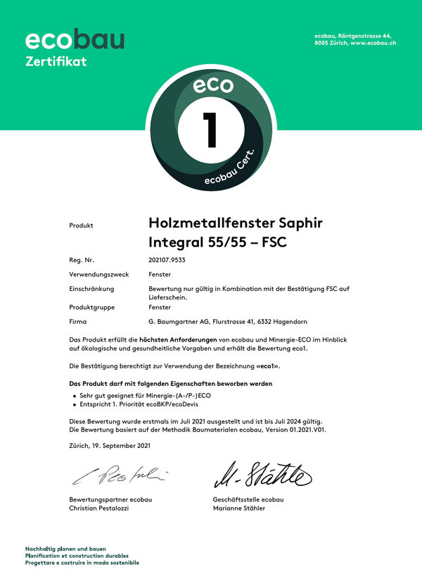 - Ecobau: Soeben sind wir von der Vereinigung Ecobau als einziges Holzmetallfenster bzw. als einziges Fenster überhaupt mit der besten Klasse 1 geehrt worden: Produkte / eco-bau.ch